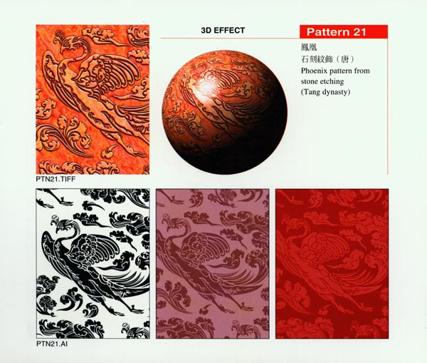 | 21 | 鳳凰 | 唐 | 石刻紋飾 | Phoenix pattern from stone etching | Tang dynasty |