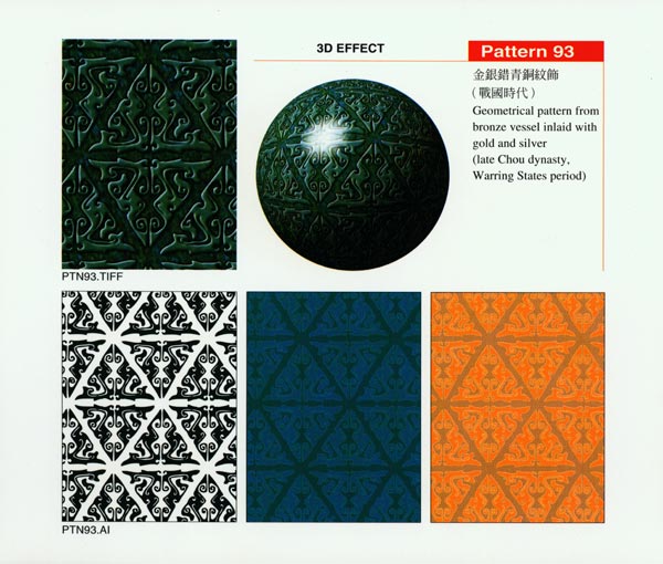 | 93 | 青銅紋 | 戰國時代 | 金銀錯青銅紋飾 | Geometrical pattern from bronze vessel inlaid with gold and silver | late Chou dynasty, Warring States period |